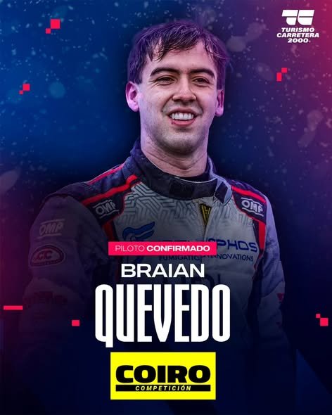 El Coiro Competición, que conduce Marco Jakos, anunció la continuidad del bahiense Braian Quevedo dentro de su estructura en el Turismo Carretera 2000, completando así su plantel de pilotos que ya piensa en el inicio del torneo, que será el 1° de marzo en el Autódromo Provincia de La Pampa, donde se desarrollará el Gran Premio ETANOL ARGENTINO.