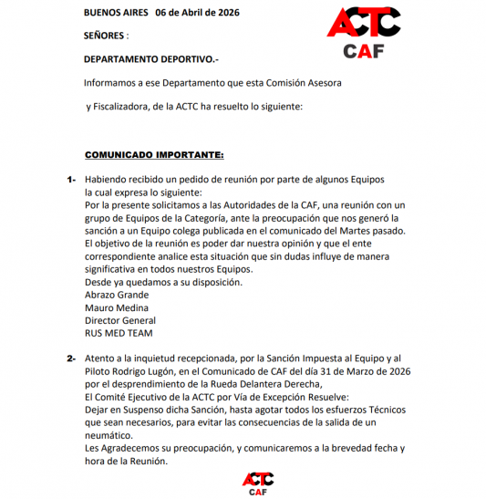 La Comisión Asesora y Fiscalizadora de la ACTC, CAF, emitió un comunicado de prensa haciendo referencia al caso Rodrigo Lugón. Teniendo en cuenta que equipos que forman parte del Turismo Carretera enviaron una nota solicitando una reunión para debatir sobre la sanción que recibió la estructura del piloto cordobés, el pedido se trató con el Departamento Ejecutivo y se resolvió lo siguiente.