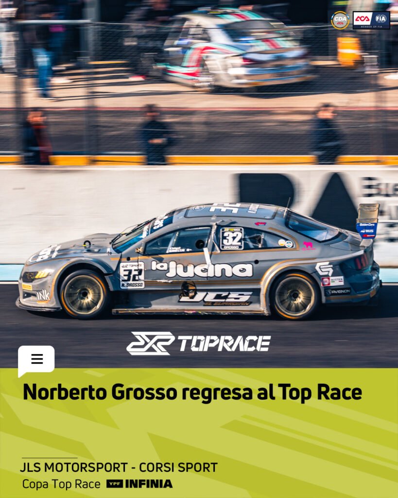 El JLS Motorsport – Corsi Sport confirmó el regreso de Norberto Grosso con el Ford Mustang #32 para la 1º fecha de la Copa Top Race YPF INFINIA, que este 1 y 2 de noviembre estará en el Autódromo “Oscar y Juan Gálvez” de Buenos Aires junto a la 8° fecha del Campeonato Argentino de Fórmula Nacional y al 9° capítulo del año de la Fiat Competizione.